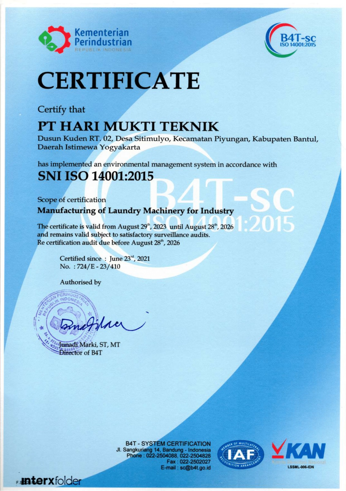 PT Hari Mukti Teknik beroperasi di bawah standar industri yang diakui. Kami memiliki sertifikasi kepatuhan yang menegaskan kualitas dan keamanan produk kami, memberikan keyakinan penuh kepada pelanggan yang membeli Mesin Laundry Industri kami. Kredibilitas adalah mata uang utama kami. Kami bangga telah dipercaya oleh berbagai institusi besar yang menuntut standar kinerja tertinggi.